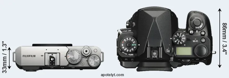The side-by-side display below illustrates the physical size and weight of the Fujifilm X-E4 and the Pentax K-1 II. The two cameras are presented according to their relative size. Three consecutive perspectives from the front, the top, and the back are available. All width, height and depth dimensions are rounded to the nearest millimeter.