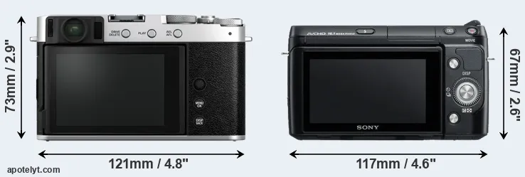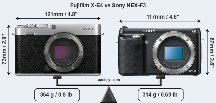 The side-by-side display below illustrates the physical size and weight of the Fujifilm X-E4 and the Sony NEX-F3. The two cameras are presented according to their relative size. Three consecutive perspectives from the front, the top, and the back are available. All width, height and depth measures are rounded to the nearest millimeter.