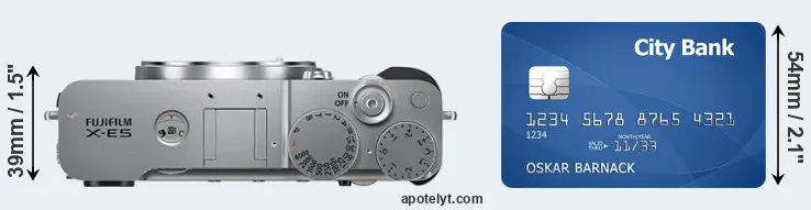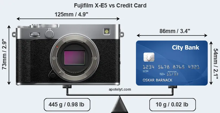 An illustration of the physical dimensions of the Fujifilm X-E5 vis-à-vis a credit card is provided in the side-by-side display below. Three consecutive perspectives from the front, the top, and the back are presented. All size dimensions are rounded to the nearest millimeter.