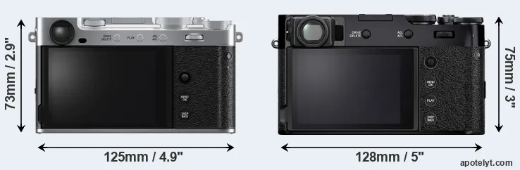 If the front view area (width x height) of the cameras is taken as an aggregate measure of their size, the Fujifilm X100V is notably larger (5 percent) than the Fujifilm X-E5. It is noteworthy in this context that the X100V is splash and dust-proof, while the X-E5 does not feature any corresponding weather-sealing.