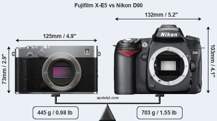 The side-by-side display below illustrates the physical size and weight of the Fujifilm X-E5 and the Nikon D90. The two cameras are presented according to their relative size. Three consecutive perspectives from the front, the top, and the back are available. All width, height and depth measures are rounded to the nearest millimeter.