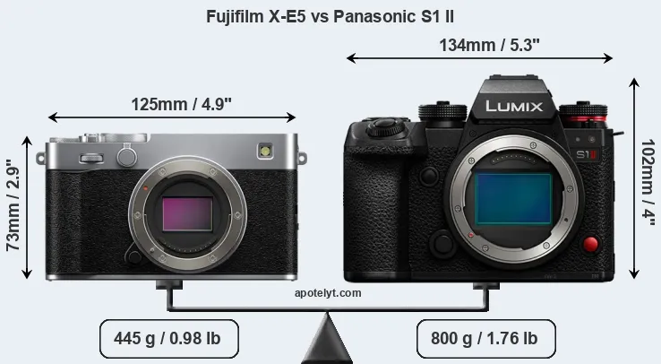 The side-by-side display below illustrates the physical size and weight of the Fujifilm X-E5 and the Panasonic S1 II. The two cameras are presented according to their relative size. Three consecutive perspectives from the front, the top, and the back are available. All width, height and depth measures are rounded to the nearest millimeter.