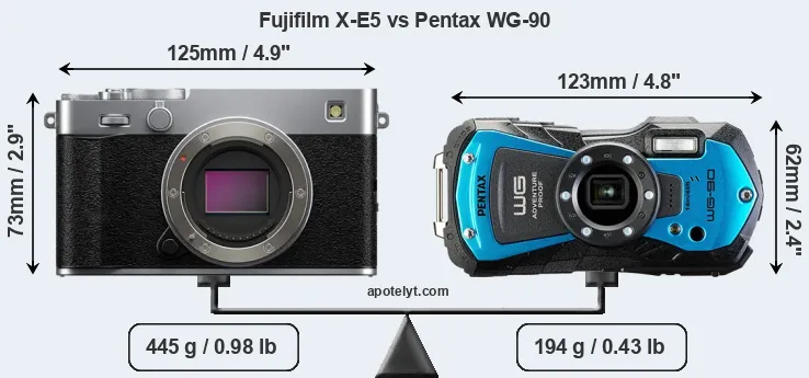 The side-by-side display below illustrates the physical size and weight of the Fujifilm X-E5 and the Pentax WG-90. The two cameras are presented according to their relative size. Three consecutive perspectives from the front, the top, and the back are available. All width, height and depth measures are rounded to the nearest millimeter.