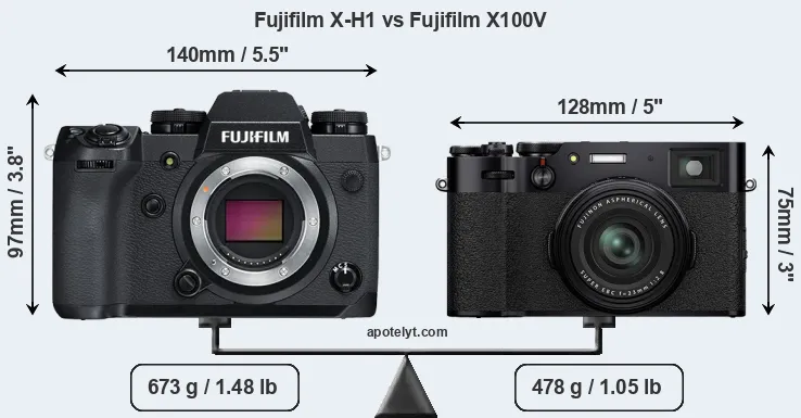 The physical size and weight of the Fujifilm X-H1 and the Fujifilm X100V are illustrated in the side-by-side display below. The two cameras are presented according to their relative size. Three successive views from the front, the top, and the rear are shown. All width, height and depth measures are rounded to the nearest millimeter.