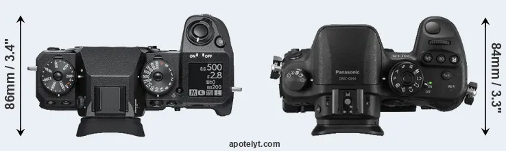 The physical size and weight of the Fujifilm X-H1 and the Panasonic GH4 are illustrated in the side-by-side display below. The two cameras are presented according to their relative size. Three consecutive perspectives from the front, the top, and the back are available. All width, height and depth measures are rounded to the nearest millimeter.