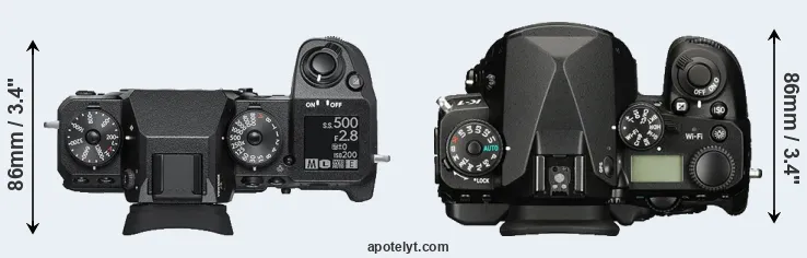 The physical size and weight of the Fujifilm X-H1 and the Pentax K-1 are illustrated in the side-by-side display below. The two cameras are presented according to their relative size. Three successive views from the front, the top, and the rear are shown. All width, height and depth measures are rounded to the nearest millimeter.