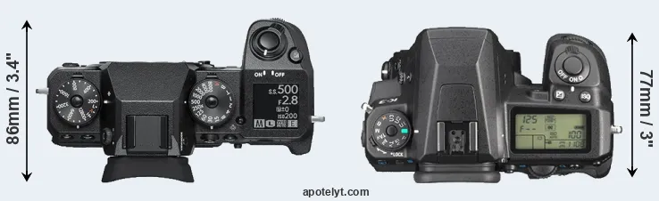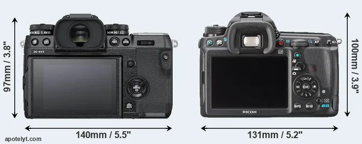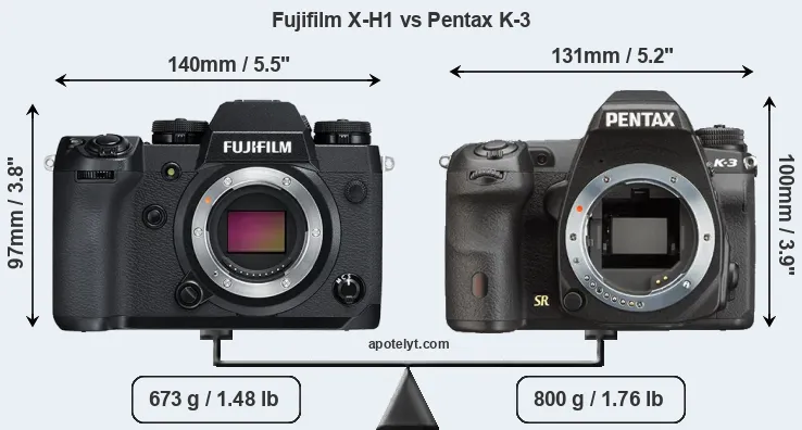 The physical size and weight of the Fujifilm X-H1 and the Pentax K-3 are illustrated in the side-by-side display below. The two cameras are presented according to their relative size. Three consecutive views from the front, the top, and the rear side are shown. All width, height and depth dimensions are rounded to the nearest millimeter.