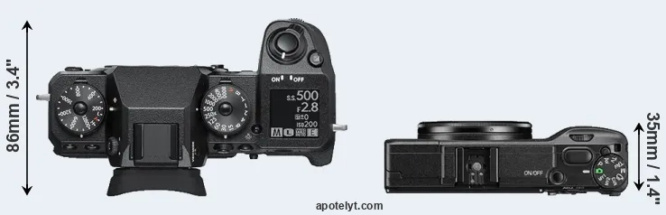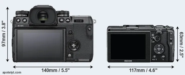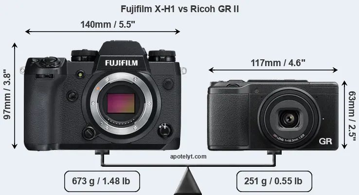 The side-by-side display below illustrates the physical size and weight of the Fujifilm X-H1 and the Ricoh GR II. The two cameras are presented according to their relative size. Three consecutive perspectives from the front, the top, and the back are available. All width, height and depth measures are rounded to the nearest millimeter.