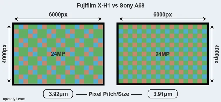 Even though the X-H1 has a slightly larger sensor, both cameras offer the same resolution of 24 megapixels. This implies that the X-H1 has a lower pixel density and larger individual pixels (with a pixel pitch of 3.92μm versus 3.91μm for the A68), which gives it a potential advantage in terms of light gathering capacity. In addition, the X-H1 is much more recent (by 2 years and 3 months) than the A68, and its sensor will have benefitted from technological advances during this time. Coming back to sensor resolution, it should be mentioned that the X-H1 has no anti-alias filter installed, so that it can capture all the detail its sensor resolves.