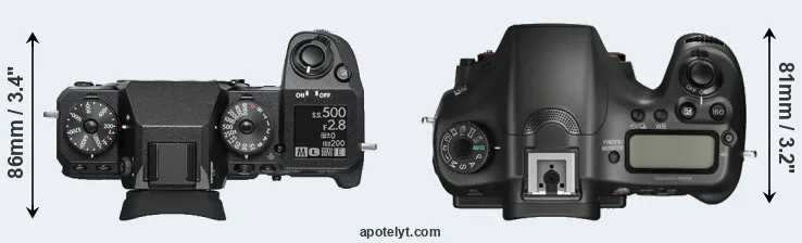 The physical size and weight of the Fujifilm X-H1 and the Sony A68 are illustrated in the side-by-side display below. The two cameras are presented according to their relative size. Three consecutive perspectives from the front, the top, and the back are available. All width, height and depth dimensions are rounded to the nearest millimeter.