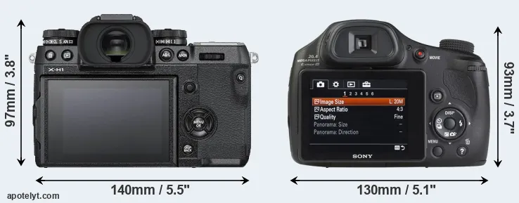 If the front view area (width x height) of the cameras is taken as an aggregate measure of their size, the Sony HX350 is notably smaller (11 percent) than the Fujifilm X-H1. It is worth mentioning in this context that the X-H1 is splash and dust resistant, while the HX350 does not feature any corresponding weather-sealing.
