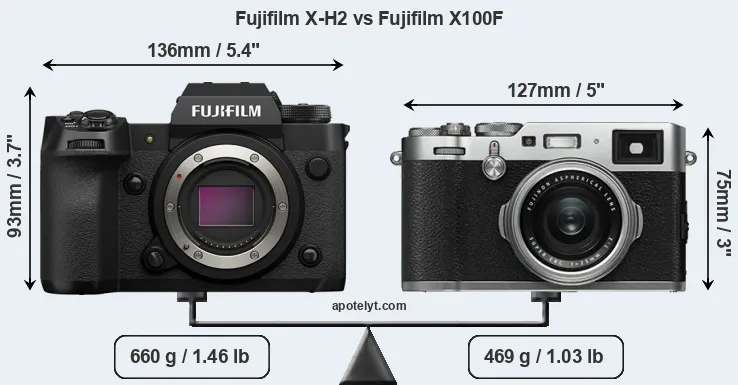 If the front view area (width x height) of the cameras is taken as an aggregate measure of their size, the Fujifilm X100F is notably smaller (25 percent) than the Fujifilm X-H2. It is worth mentioning in this context that the X-H2 is splash and dust resistant, while the X100F does not feature any corresponding weather-sealing.