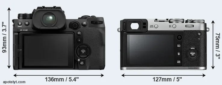 The side-by-side display below illustrates the physical size and weight of the Fujifilm X-H2 and the Fujifilm X100F. The two cameras are presented according to their relative size. Three consecutive perspectives from the front, the top, and the back are available. All size dimensions are rounded to the nearest millimeter.
