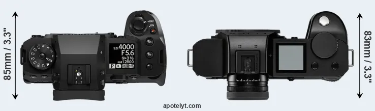 The side-by-side display below illustrates the physical size and weight of the Fujifilm X-H2 and the Leica SL2-S. The two cameras are presented according to their relative size. Three successive views from the front, the top, and the rear are shown. All size dimensions are rounded to the nearest millimeter.