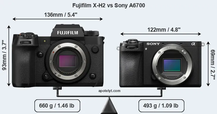 If the front view area (width x height) of the cameras is taken as an aggregate measure of their size, the Sony A6700 is considerably smaller (33 percent) than the Fujifilm X-H2. Moreover, the A6700 is markedly lighter (25 percent) than the X-H2. In this context, it is worth noting that both cameras are splash and dust-proof and can, hence, be used in inclement weather conditions or harsh environments.
