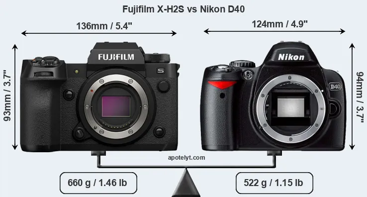 If the front view area (width x height) of the cameras is taken as an aggregate measure of their size, the Nikon D40 is notably smaller (8 percent) than the Fujifilm X-H2S. Moreover, the D40 is markedly lighter (21 percent) than the X-H2S. It is worth mentioning in this context that the X-H2S is splash and dust resistant, while the D40 does not feature any corresponding weather-sealing.