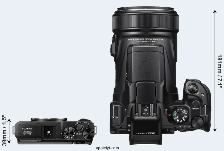 The side-by-side display below illustrates the physical size and weight of the Fujifilm X-M1 and the Nikon P1000. The two cameras are presented according to their relative size. Three consecutive views from the front, the top, and the rear side are shown. All width, height and depth measures are rounded to the nearest millimeter.