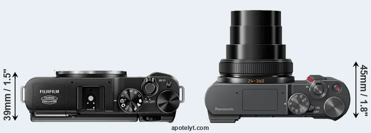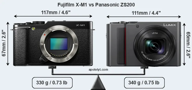 The side-by-side display below illustrates the physical size and weight of the Fujifilm X-M1 and the Panasonic ZS200. The two cameras are presented according to their relative size. Three consecutive perspectives from the front, the top, and the back are available. All width, height and depth measures are rounded to the nearest millimeter.