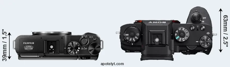 The physical size and weight of the Fujifilm X-M1 and the Sony A9 are illustrated in the side-by-side display below. The two cameras are presented according to their relative size. Three consecutive perspectives from the front, the top, and the back are available. All width, height and depth dimensions are rounded to the nearest millimeter.