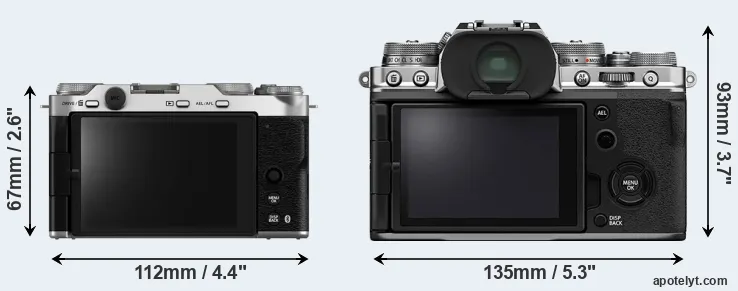 The side-by-side display below illustrates the physical size and weight of the Fujifilm X-M5 and the Fujifilm X-T4. The two cameras are presented according to their relative size. Three consecutive perspectives from the front, the top, and the back are available. All width, height and depth dimensions are rounded to the nearest millimeter.