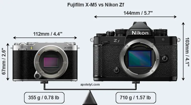 If the front view area (width x height) of the cameras is taken as an aggregate measure of their size, the Nikon Zf is considerably larger (98 percent) than the Fujifilm X-M5. Moreover, the Zf is substantially heavier (100 percent) than the X-M5. It is noteworthy in this context that the Zf is splash and dust-proof, while the X-M5 does not feature any corresponding weather-sealing.