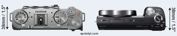 An illustration of the physical size and weight of the Fujifilm X-M5 and the Sony NEX-5N is provided in the side-by-side display below. The two cameras are presented according to their relative size. Three successive views from the front, the top, and the rear are shown. All width, height and depth dimensions are rounded to the nearest millimeter.