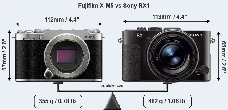 The physical size and weight of the Fujifilm X-M5 and the Sony RX1 are illustrated in the side-by-side display below. The two cameras are presented according to their relative size. Three successive views from the front, the top, and the rear are shown. All width, height and depth measures are rounded to the nearest millimeter.