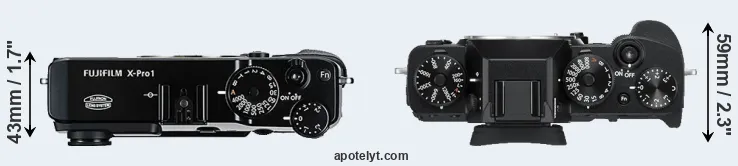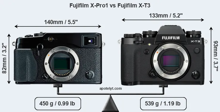The side-by-side display below illustrates the physical size and weight of the Fujifilm X-Pro1 and the Fujifilm X-T3. The two cameras are presented according to their relative size. Three consecutive views from the front, the top, and the rear side are shown. All width, height and depth dimensions are rounded to the nearest millimeter.