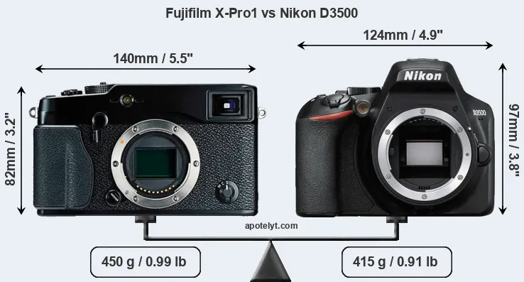 The side-by-side display below illustrates the physical size and weight of the Fujifilm X-Pro1 and the Nikon D3500. The two cameras are presented according to their relative size. Three successive views from the front, the top, and the rear are shown. All size dimensions are rounded to the nearest millimeter.