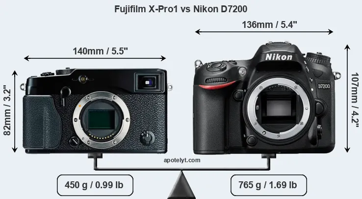 If the front view area (width x height) of the cameras is taken as an aggregate measure of their size, the Nikon D7200 is notably larger (27 percent) than the Fujifilm X-Pro1. Moreover, the D7200 is substantially heavier (70 percent) than the X-Pro1. It is noteworthy in this context that the D7200 is splash and dust-proof, while the X-Pro1 does not feature any corresponding weather-sealing.