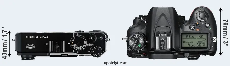 The side-by-side display below illustrates the physical size and weight of the Fujifilm X-Pro1 and the Nikon D7200. The two cameras are presented according to their relative size. Three successive views from the front, the top, and the rear are shown. All size dimensions are rounded to the nearest millimeter.