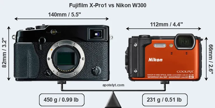 The physical size and weight of the Fujifilm X-Pro1 and the Nikon W300 are illustrated in the side-by-side display below. The two cameras are presented according to their relative size. Three consecutive perspectives from the front, the top, and the back are available. All width, height and depth measures are rounded to the nearest millimeter.