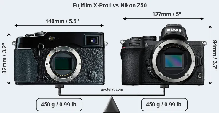 The physical size and weight of the Fujifilm X-Pro1 and the Nikon Z50 are illustrated in the side-by-side display below. The two cameras are presented according to their relative size. Three consecutive perspectives from the front, the top, and the back are available. All width, height and depth dimensions are rounded to the nearest millimeter.