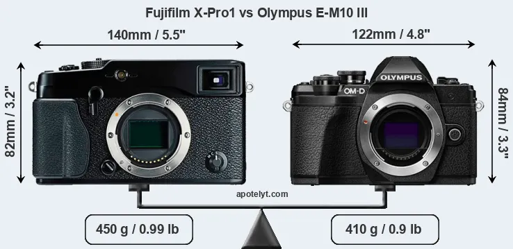 The side-by-side display below illustrates the physical size and weight of the Fujifilm X-Pro1 and the Olympus E-M10 III. The two cameras are presented according to their relative size. Three successive views from the front, the top, and the rear are shown. All width, height and depth measures are rounded to the nearest millimeter.