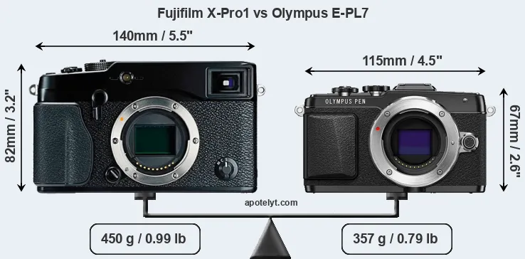 The side-by-side display below illustrates the physical size and weight of the Fujifilm X-Pro1 and the Olympus E-PL7. The two cameras are presented according to their relative size. Three successive views from the front, the top, and the rear are shown. All width, height and depth measures are rounded to the nearest millimeter.