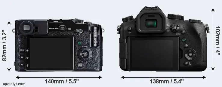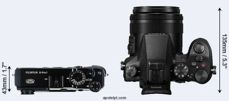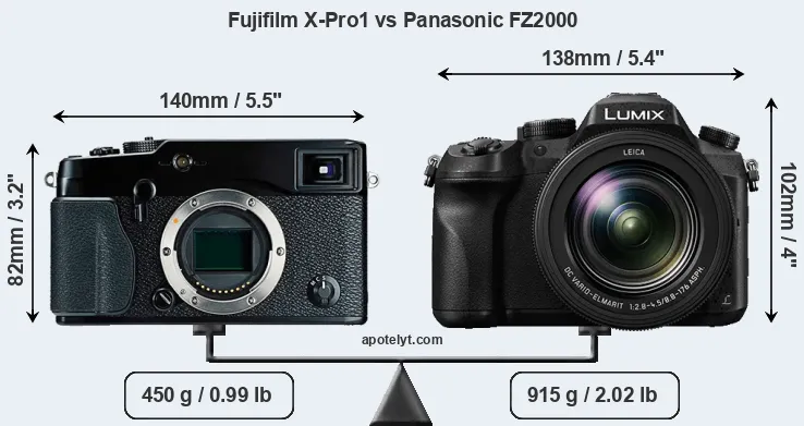 The physical size and weight of the Fujifilm X-Pro1 and the Panasonic FZ2000 are illustrated in the side-by-side display below. The two cameras are presented according to their relative size. Three consecutive perspectives from the front, the top, and the back are available. All size dimensions are rounded to the nearest millimeter.