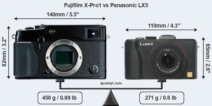 If the front view area (width x height) of the cameras is taken as an aggregate measure of their size, the Panasonic LX5 is considerably smaller (38 percent) than the Fujifilm X-Pro1. In this context, it is worth noting that neither the X-Pro1 nor the LX5 are weather-sealed.