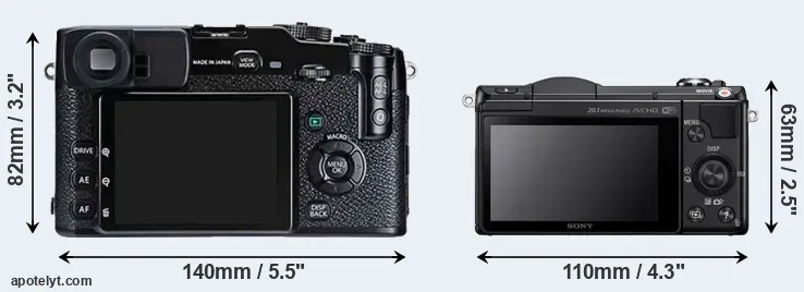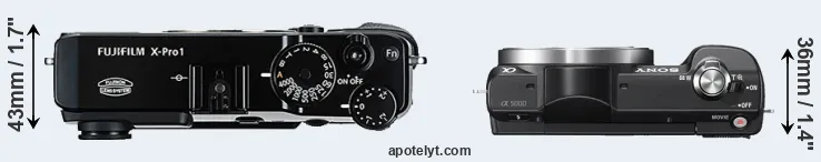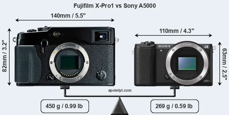 The physical size and weight of the Fujifilm X-Pro1 and the Sony A5000 are illustrated in the side-by-side display below. The two cameras are presented according to their relative size. Three consecutive perspectives from the front, the top, and the back are available. All width, height and depth dimensions are rounded to the nearest millimeter.