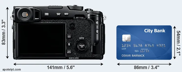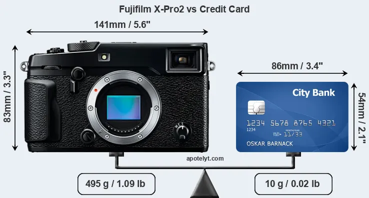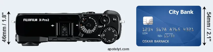The physical dimensions of the Fujifilm X-Pro2 relative to a credit card are illustrated in the side-by-side display below. Three consecutive views from the front, the top, and the rear side are shown. All size dimensions are rounded to the nearest millimeter.