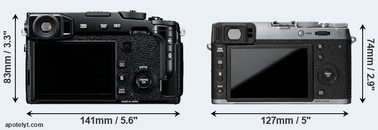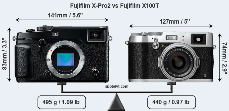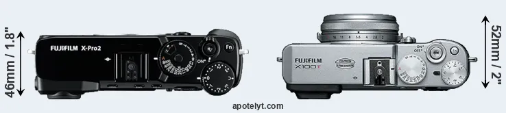 The side-by-side display below illustrates the physical size and weight of the Fujifilm X-Pro2 and the Fujifilm X100T. The two cameras are presented according to their relative size. Three consecutive perspectives from the front, the top, and the back are available. All size dimensions are rounded to the nearest millimeter.