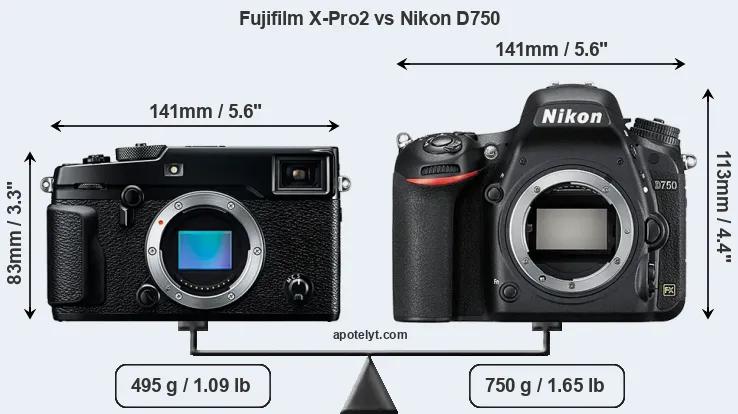 The side-by-side display below illustrates the physical size and weight of the Fujifilm X-Pro2 and the Nikon D750. The two cameras are presented according to their relative size. Three successive views from the front, the top, and the rear are shown. All width, height and depth dimensions are rounded to the nearest millimeter.