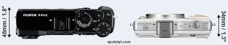 An illustration of the physical size and weight of the Fujifilm X-Pro2 and the Olympus E-PM2 is provided in the side-by-side display below. The two cameras are presented according to their relative size. Three successive views from the front, the top, and the rear are shown. All width, height and depth dimensions are rounded to the nearest millimeter.
