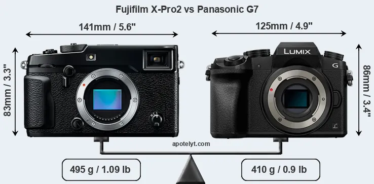 If the front view area (width x height) of the cameras is taken as an aggregate measure of their size, the Panasonic G7 is notably smaller (8 percent) than the Fujifilm X-Pro2. Moreover, the G7 is markedly lighter (17 percent) than the X-Pro2. It is worth mentioning in this context that the X-Pro2 is splash and dust resistant, while the G7 does not feature any corresponding weather-sealing.