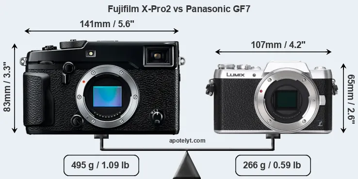 If the front view area (width x height) of the cameras is taken as an aggregate measure of their size, the Panasonic GF7 is considerably smaller (41 percent) than the Fujifilm X-Pro2. Moreover, the GF7 is substantially lighter (46 percent) than the X-Pro2. It is worth mentioning in this context that the X-Pro2 is splash and dust resistant, while the GF7 does not feature any corresponding weather-sealing.
