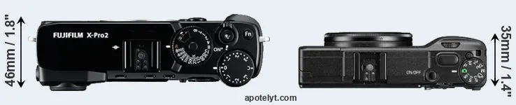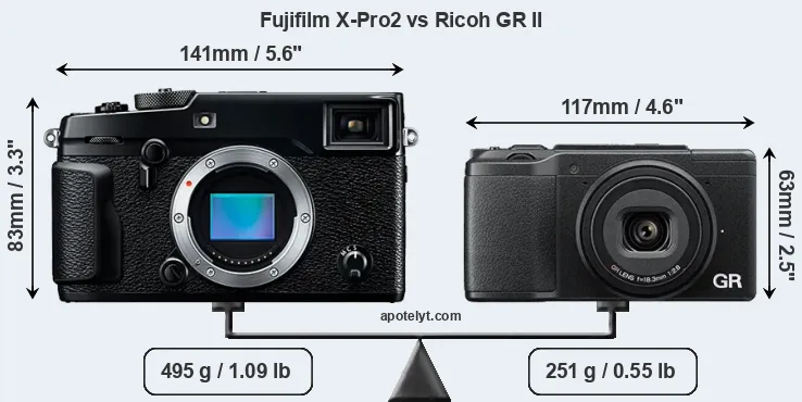 If the front view area (width x height) of the cameras is taken as an aggregate measure of their size, the Ricoh GR II is considerably smaller (37 percent) than the Fujifilm X-Pro2. It is worth mentioning in this context that the X-Pro2 is splash and dust resistant, while the GR II does not feature any corresponding weather-sealing.
