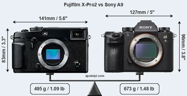 If the front view area (width x height) of the cameras is taken as an aggregate measure of their size, the Sony A9 is somewhat larger (4 percent) than the Fujifilm X-Pro2. Moreover, the A9 is substantially heavier (36 percent) than the X-Pro2. In this context, it is worth noting that both cameras are splash and dust-proof and can, hence, be used in inclement weather conditions or harsh environments.