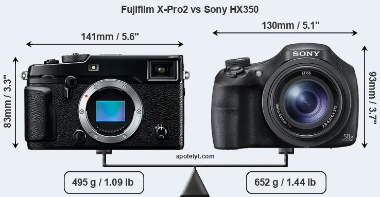 If the front view area (width x height) of the cameras is taken as an aggregate measure of their size, the Sony HX350 is somewhat larger (3 percent) than the Fujifilm X-Pro2. It is worth mentioning in this context that the X-Pro2 is splash and dust resistant, while the HX350 does not feature any corresponding weather-sealing.