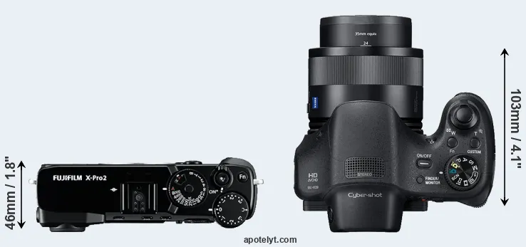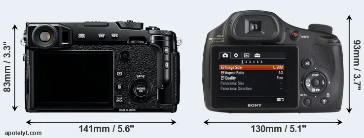 The side-by-side display below illustrates the physical size and weight of the Fujifilm X-Pro2 and the Sony HX350. The two cameras are presented according to their relative size. Three consecutive views from the front, the top, and the rear side are shown. All width, height and depth dimensions are rounded to the nearest millimeter.