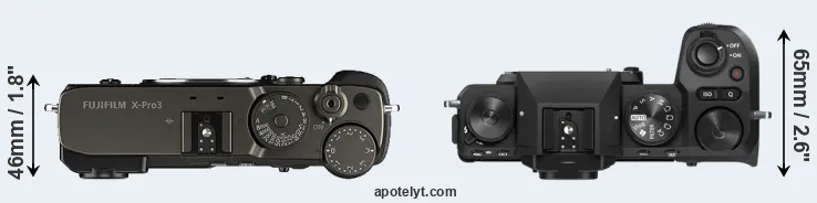 The side-by-side display below illustrates the physical size and weight of the Fujifilm X-Pro3 and the Fujifilm X-S20. The two cameras are presented according to their relative size. Three consecutive views from the front, the top, and the rear side are shown. All width, height and depth dimensions are rounded to the nearest millimeter.