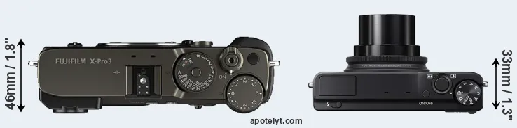 If the front view area (width x height) of the cameras is taken as an aggregate measure of their size, the Fujifilm XQ2 is considerably smaller (50 percent) than the Fujifilm X-Pro3. It is worth mentioning in this context that the X-Pro3 is splash and dust resistant, while the XQ2 does not feature any corresponding weather-sealing.